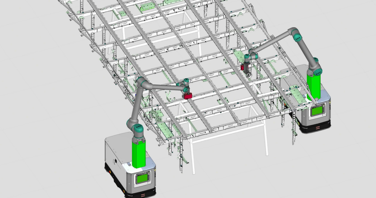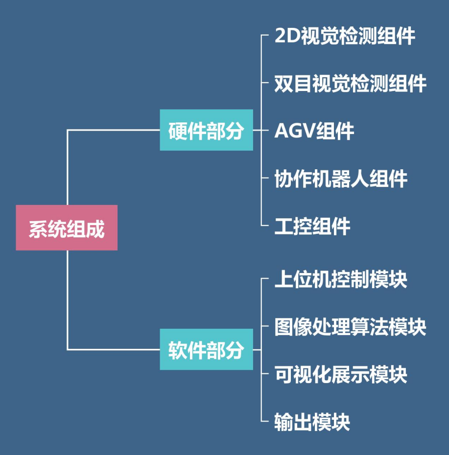 采用AGV搭載協(xié)作機器人及視覺檢測終端的方式,通過自動規(guī)劃檢測路徑對被測對象做繞機檢測,完成對支架大炮托板裝配質量的檢測。系統(tǒng)主要分為兩大塊,硬件部分和軟件部分。