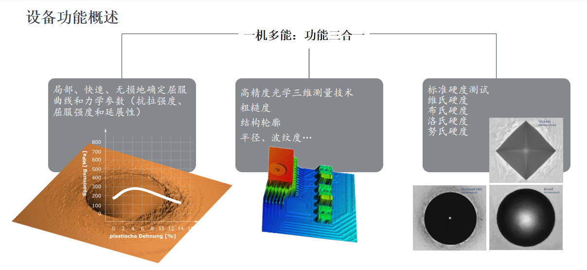 ●單臺設(shè)備集拉伸特性測試、通用硬度測試和光學(xué)測量技術(shù)于一體,可實現(xiàn)抗拉強度、屈服強度、延展性、屈服曲線、粗糙度、結(jié)構(gòu)輪廓、半徑、波紋度、維氏硬度、布氏硬度、洛氏硬度、努氏硬度、等多種性能參數(shù)的測量。